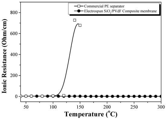 Figure 9 shows the ionic resistivity of the conductivity cells (SUS//EPEM//SUS), in which EPEM was sandwiched between the two blocking stainless steel electrodes, as a function of the temperature. Regarding the PE separator as a reference, the ionic resistivity increased rapidly at ~120 °C owing to the melting of the PE separator, which supported the thermal shut-down behavior of the PE separator. However, the ionic resistance of the conductivity cells containing EPEM did not increase significantly. The conductivity cell did not display the shut-down behavior due to the complete closure of the membrane pore structure by the melting of PVdF (m.p = 165 °C) or swollen PVdF up to a temperature of 300 °C, indicating high thermal stability. In a previous study, the differential scanning calorimetry curve of the PVdF membrane containing an electrolyte solution displayed two major peaks, which corresponded to the melting of the swollen and partially swollen polymers on the surface and inner region of the fibers, respectively [,]. The SiO2-based skin structure in the composite nanofiber may prevent the closure of the pore structure by the melt flow of the swollen parts of PVdF or PVdF itself.