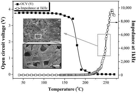 Figure 10 shows the thermal stability of the prototype cell (MCMB anode/EPEM/LiCoO2 cathode). The OCV and impedance at 1 kHz were measured in the temperature range of 40 °C–300 °C to investigate the thermal stability of the electrospun SiO2/PVdF composite membrane in the lithium cell containing LiCoO2 and MCMB as the cathode and anode, respectively. The cell was charged to 50% SOC. Regarding the prototype cell using the PE separator (MCMB anode/PE/LiCoO2 cathode), the OCV gradually decreased at 120 °C and was almost zero at 140 °C. Additionally, the impedance at 1 KHz sharply increased at 130 °C, similar to the sharp increase in the ionic resistivity displayed in Figure S5. This is a typical shut-down behavior due to the melting of the PE separator at ~130 °C. The shut-down behavior of the commercial PE separator was observed regardless of the presence of the electrode materials, as the electrode materials started decomposing at a much higher temperature than the melting point of PE [,]. In the prototype cell comprising the composite membrane, the AC impedance started increasing sharply at ~225 °C, dissimilar to the ionic resistance behavior of the conductivity cell, as shown in Figure 9; the OCV decreased steeply at ~170 °C, almost reaching 0 V at ~180 °C. The inset SEM image in Figure 10 also shows the composite membrane after the OCV and AC impedance measurements of the prototype cell up to 270 °C (the dashed square in Figure 10). Although this composite membrane was exposed to temperatures of >270 °C, its three-dimensional network structure was maintained without the closure of the pore structure. LiCoO2 in LIBs thermally decomposes through O2 release at ~250 °C, and the electrolyte solution degrades on the electrode surface []. These reactions could have caused the rapid increase in the AC impedance of the prototype cell containing the SiO2/PVdF composite membrane, dissimilar to the conductivity cell without the electrode materials. A sufficient increase in the ionic resistance of the thermal shut-down function might require the complete closure of the pore structure through the melt flow of PVdF exhibiting a high melt viscosity. During the thermal stability test of the prototype cell, the swollen PVdF or PVdF itself of the composite membrane might have been overheated by the large amount of heat generated from the thermal decomposition of the electrodes, significantly reducing the viscosity. The pore structure of the composite membrane might be sufficiently broken by the overheated PVdF in the swollen composite membrane of the prototype cell. However, the SiO2-based skin structure in the electrospun SiO2/PVdF blend nanofiber might prevent the closure of the membrane pore structure from a flow of the overheated PVdF melt (Figure 9). Therefore, the unstable interface formed by electrode and electrolyte decomposition might further account for the sharp increase in the AC impedance and steep decrease in OCV rather than the pore structure closure through PVdF melting. These results confirmed that the electrospun SiO2/PVdF composite membrane exhibited high thermal stability in the LIB at temperatures of >200 °C without the melting of the separator.