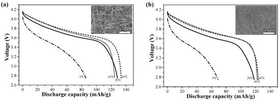 The discharge capacities of the prototype cells comprising EPEM in 1 M LiPF6–EC/PC/DEC/VC (30.8/15.0/39.2/2.0 wt.%) were measured in the temperature region of 0 °C and 60 °C. As shown in Figure 12a, the prototype cell with EPEM exhibited good discharge capacities in the operating temperature range. However, the discharge capacity decreased greatly, particularly in the low-temperature region (0 °C). Figure 12b shows the discharge capacities of the prototype cells with the composite membrane exhibiting a porosity of ~40%. The composite membrane with lower porosity displayed lower discharge capacity. The porosity of the composite membrane was controlled by heat-pressing the composite membrane. Heat-pressing may produce closed pore structures. An increase in the closed pore might produce poor discharge capacity owing to decreased electrolyte uptake and limited ion transfer.
