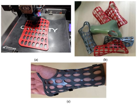 Three-dimensional printing wrist–hand orthoses: (a) example of a flat orthosis from PETG during the printing process; (b) examples of different thermoformed orthoses from both PLA and PETG; and (c) a PLA orthosis placed on the user’s hand and secured with three Velcro strips in the palm, wrist, and forearm zones.