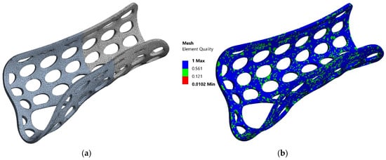 The geometric model, obtained by 3D scanning the actual 3DP-WHO models formed through thermoforming, was imported into ANSYS. It was discretized (Figure 2a) using 2 mm-sized elements, resulting in a mesh with 159,007 nodes and 85,876 elements, conforming to the geometric features (such as geometric concentrators, fillet radii, etc.) present in the analyzed model. The mesh was modeled with finite elements of the type SOLID187. The element quality is presented in Figure 2b, ranging from 0.0102 (minimum) to 1 (maximum), with most elements showing good quality, as indicated by the dominance of blue and green colors.