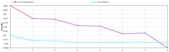 The analysis setup included defining the type of analysis (transient with nonlinear geometric effects) and the solution method (full Newton–Raphson). The solver computed the response of the structure iteratively, checking for convergence at each step. The solution converged after 219 iterations and 477,021 equations. The convergence criteria, focusing on force residuals, indicated effective convergence, as shown by the significant decrease in force residuals over the iterations in the convergence plot (Figure 4).