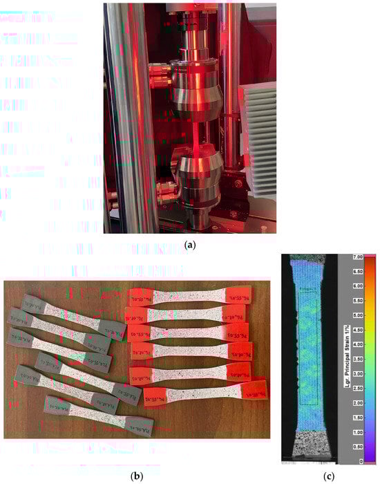 Experimental work: (a) image of tensile testing using DIC; (b) the gray PLA and red PETG specimens prepared for testing; and (c) illustrative image of DIC investigations, displaying a strain map with principal strain distribution on a tested specimen.