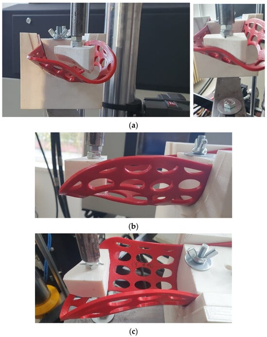 Three-dimensional printing wrist–hand orthoses flexural tests: (a) front views of the testing setup with force applied to the distal end of the PETG orthosis, (b) side view showing the orthosis bending, and (c) top view highlighting the orthosis fixation in the testing equipment and the zone where force was applied.
