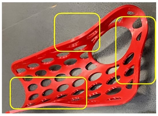 It could be seen that the most stressed zone corresponded to the fractured zones from the experimental tests, as presented in Figure 10 for the PLA orthosis with 55% infill density.