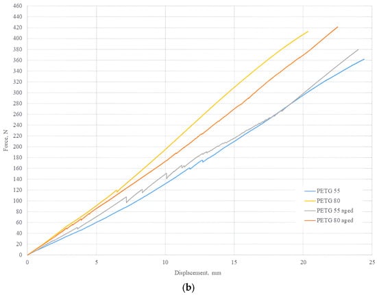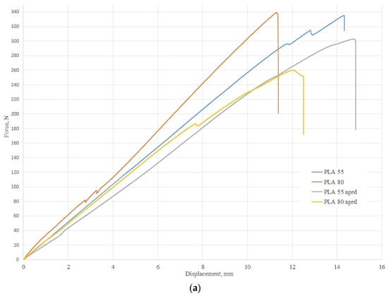 Analyzing the graphics in Figure 9a for the PLA orthoses, it can be noted that the orthoses with 80% infill density failed at lower displacements. Additionally, the effects of moisture and aging were less significant for the 55% dense orthoses compared to their counterparts with 80% density.