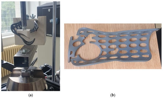 To investigate the mechanical resistance of the 3DP-WHOs subjected to flexion, 2-point static testing was conducted. Figure 3 shows the experimental setup on the same Instron 8872 UTM. The orthoses were fixed in a support made of ABS (Mojo 3D printer, Stratasys, Eden Prairie, MA, USA) in a cantilever position, as in the study by Cazon et al. [] (Figure 6).