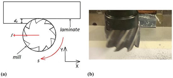CFRP laminates were then subjected to a mechanical recycling method based on the milling process to produce recovered carbon fibre chips. To do this, a 5-axis CNC machining centre (C. B. Ferrari) equipped with an HSS end mill tool 40 mm in diameter was used to perform the peripheral milling process. In Figure 1, a schematisation (Figure 1a) and the execution of a mechanical recycling operation (Figure 1b) are reported. A well-defined set of cutting parameters was adopted during the milling process to allow for a high material removal rate (MRR). A spindle speed (s) of 200 rpm, a feed rate (f) of 1000 mm/min and a depth of cut (dc) of almost 5 mm were chosen for the mechanical recycling process [,]. The use of the defined set of cutting parameters derives from research activities focused on the effect of their combination on the recovered chip size, as well as on the cutting power required during the machining operations and the cutting energy demand. It was observed that the adoption of low s values in combination with high f and dc promotes high MRR values and the formation of larger chips, while also achieving the lowest specific cutting energy values [,].