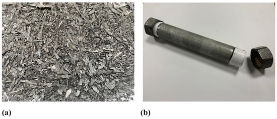 - In the first step, the recovered fibres were treated with an 11% acetic acid solution by volume to promote the swelling of the chip material. The fibres were placed in a Teflon-lined stainless-steel reactor vessel measuring 200 mm in length and 28 mm in diameter (Figure 2b). The vessel was sealed with the chemical solution, maintaining a fibre-to-solution weight ratio of 1:5, and heated in an oven at 150 °C for 8 h. Then, the reactor was removed and allowed to cool down naturally. Once the chemical treatment was completed, the recovered fibres were thoroughly washed with acetone.