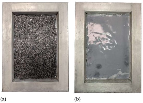Both the treated and untreated recovered fibres were used to produce new composite materials (respectively labelled as T-RC and U-RC) by means of the compression moulding technique. Figure 3 shows some of the production phases where both the treated and untreated recycled fibres were stacked (Figure 3a) and impregnated (Figure 3b) with the flame-retardant added resin films. Its choice is related to the fact that the category of recycled composite materials produced following the recycling processes can be reused and reintroduced in industrial sectors as secondary components since they are reinforced with short fibres. Therefore, since this study is aimed at the recyclability of end-of-life composite materials from the aeronautic sector, it was decided to use a resin film with added flame-retardant phases as the new matrix.