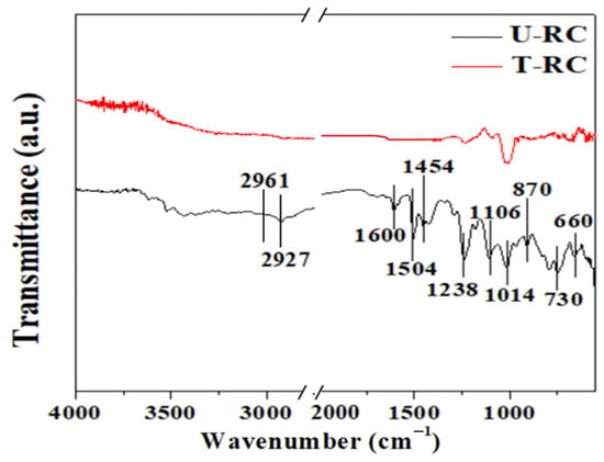 On the other hand, looking at the spectrum of the T-RC sample, it is possible to observe that it dramatically changes because of the solvothermal recycling process. The typical bands that identify the epoxy matrix completely disappear, meaning that the old matrix is removed from the surface of the recovered fibres. However, the band at 1014 cm−1, together with the one above 3000 cm−1, typical of the C-OH group, is still visible, indicating that partial oxidation on the fibre’s surface occurs [].