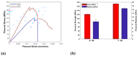 From the bending tests, the flexural strength (σf,max, i.e., the maximum flexural stress) and the flexural modulus (Ef, using the chord method described by Equation (5)) were evaluated: