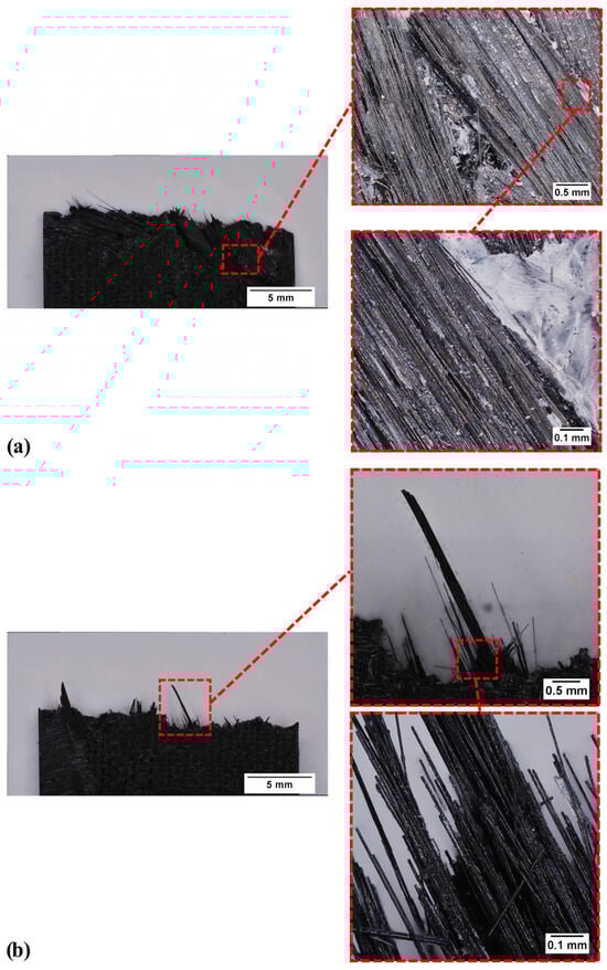 In Figure 6, the failure regions of both samples are represented. Focusing on the U-RC (Figure 6a), the residues of the old matrix on the fibre surface result in the initiation of pull-out and debonding phenomena near the failure region. This aspect leads to the complete separation of fibre bundles within the sample’s thickness, promoting the formation of new surfaces where the fibre bundles, which do not contain traces of new matrix, are exposed. This failure behaviour highlights the poor adhesion at the fibre–matrix interface when untreated recycled fibres are employed. In contrast, the failure region of the T-RC sample exhibits a distinct and well-defined failure region where individual fibres are clearly visible. This is due to the beneficial effects of the chemical treatment, which effectively dissolves the residues of old matrix from the fibre surface and within the fibre bundles. Therefore, in this failure region, minimal fibre pull-out occurs, and no fibre debonding is observed. This aspect, in conjunction with the results from the mechanical tests, highlights a significant improvement in fibre–matrix adhesion that can be associated with the enhanced surface characteristics of the treated fibres.