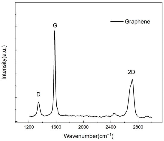 Graphene ink synthesis was performed at the National Graphene Institute in Manchester, UK, using a micro-fluidization machine (IDEX, Worcester, UK). The Raman spectroscopy of graphene is presented in Figure 1. Raman spectra of the graphene-containing samples were recorded using a 532 nm laser excitation wavelength. The Raman spectra of Graphene show characteristic peaks at ~1352.05 cm−1, 1582.53 cm−1, and 2727.99 cm−1 corresponding to D, G, and 2D bands, which are observed for all samples. The G/2D height ratio is roughly equal to 2:1, which represents the graphene being single layer/few layers. The D band indicates the graphene sample’s disorder, which is due to the edge effect and structural defects introduced to graphene during the micro-fluidization process.