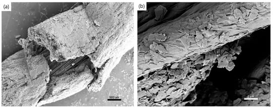 SEM surface morphology of sensor yarns after the tensile test for (a) a glass yarn-based sensor at 500× magnification and (b) a cotton yarn-based sensor at 5000× magnification.