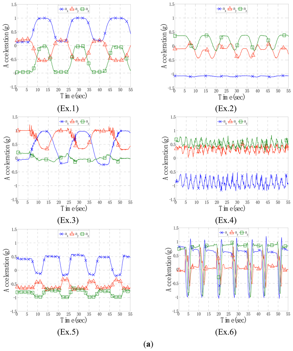 The adopted features (ax, ay, az, θ) probably provided an insufficient number of characteristics for the algorithm, thus preventing Ex.6, a complex exercise involving many full-range spiral rotations of the joints in the hands, wrists, elbows, and shoulders from being recognized, because more features with respect to angle variations might be required for this exercise than for the other five exercises. However, distributions of the acceleration and included angle for Ex.6, as shown in Figure 4a,b, were apparently different from those of other exercises. The waveforms of Ex.6 presented obvious impulse peaks which might require another features and rules of fuzzy logic in the training procedure to identify the exercise in this study.