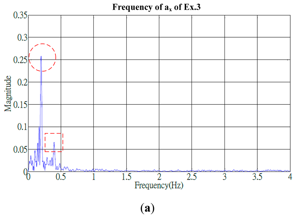 Identifying adequate features in frequency domain was crucial to progress the same algorithm for conducting advanced analysis. Signals of the cyclical exercises exhibited apparent periodical variations in the time domain and, using the fast Fourier transform (FFT), were transformed into a spectrum that represented the frequency of the similar motions. The frequency groups of the proposed exercises generally included a primary peak and one (or more) secondary peaks. The secondary peak was defined as a peak that measured over a quarter of the amplitude of the primary peak. For example, the spectrum of Ex.3 (Figure 9) shows the primary frequency groups of (ax, ay, az) at (0.2, 0.25, 0.25) Hz and the secondary groups at (0.4, 0.55, 0.55) Hz, respectively, and an additional minor secondary peak at 0.8 Hz was presented by the ay component.