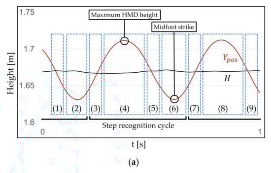 Correlation of and H with the motion when jog-in-place is performed. (a) 3 to 6 represent the step recognition cycle of our method. This cycle corresponds to both feet. (b) The jog-in-place cycle repeats the order of right toe strike–mid stance (midfoot strike)–toe off–double limb unsupported (maximum HMD height)–left toe strike–mid stance (midfoot strike)–toe off–double limb unsupported (maximum HMD height)–right toe strike.