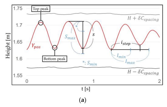 where s (m) is the difference between the top peak (maximum HMD height) and the bottom peak (midfoot strike) of the WIP pattern, which is located in the (m) and (m) thresholds. The step interval (s) is measured between two bottom peaks, which is located in the (s) and (s) thresholds. (m/s) and (m/s) are the minimum and maximum values by which can change, respectively (Figure 8).