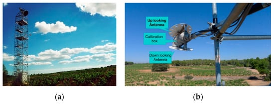 (a) ELBARA-II L-band radiometer tower also holding the Oceanpal GNSS-R antennas over a vineyard field at El Renegado MELBEX site at the Valencia Anchor Station; (b) Detail of the GNSS-R deployment indicating the essential elements.
