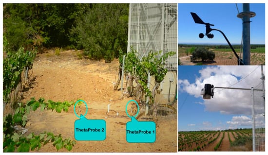 Two soil moisture ThetaProbe sensors [], type ML2x from the company Delta-T Devices, UK, were placed at the bottom of the tower. As displayed in Figure 3, the ThetaProbe 1 is close to a vine stump, and the ThetaProbe 2 is in the middle of two rows, both of them measuring soil moisture for top 5 cm. The averages of the measurements performed with these two probes were assumed to be representative of the soil moisture conditions in the MELBEX-III field site, and thus considered as the soil moisture reference in this study. A Davis Vantage Pro2 Plus weather station [] was installed on the tower, measuring rainfall, temperature, humidity, and solar radiation.
