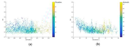 Besides soil moisture, vegetation and soil roughness also have an impact at L-band. In this paper, soil roughness was considered to be constant, and vegetation was assumed to have a homogeneous distribution. 250 m resolution MODIS (Moderate Resolution Imaging Spectroradiometer) EVI (Enhanced Vegetation Index) data were used for vegetation estimation. Spline interpolation was used to obtain daily EVI. Figure 5a, b shows LHCP reflectivity variation with azimuth and elevation. The data was measured in August 2014, with high vegetation, without any precipitation, and the soil moisture was constant at 0.10~0.11 m3/m3. The dependence of Rrl(LHCP reflectivity) with elevation is more obvious. So, we considered the azimuthal effect negligible. It was also assumed that the soil moisture diurnal variation was not obvious, so we could take the average over the Oceanpal measured LHCP/RHCP reflectivity with same incidence in one day.