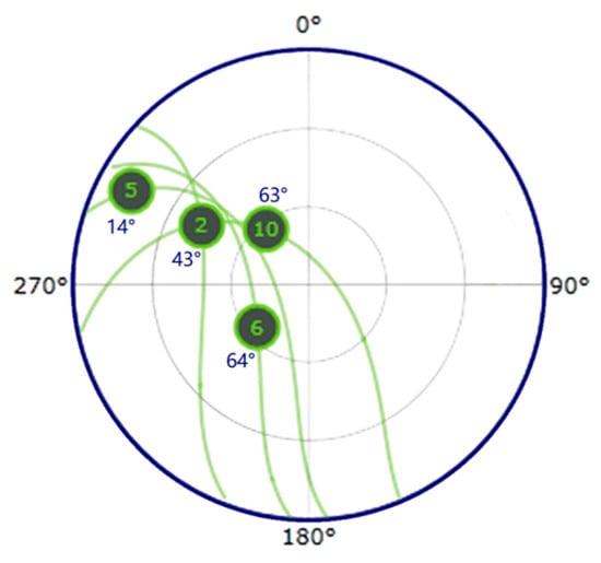 With the purpose of understanding how the reflected signal varies with the change of soil moisture and GNSS satellite elevation, some raw data from the GPS in-view satellites PRN 02, PRN05, PRN06 and PRN 10 (Figure 6) were selected for the days 8 and 9, September 2014. Soil moisture was constant at 0.1 m3/m3 until 21:00 UTC on 9th September, when 11 mm precipitation occurred and soil moisture raised to 0.22 m3/m3. Figure 6 then shows the GPS satellites skyplot of the MELBEX ELBARA-II site at 22:00 UTC on 9th September 2014.