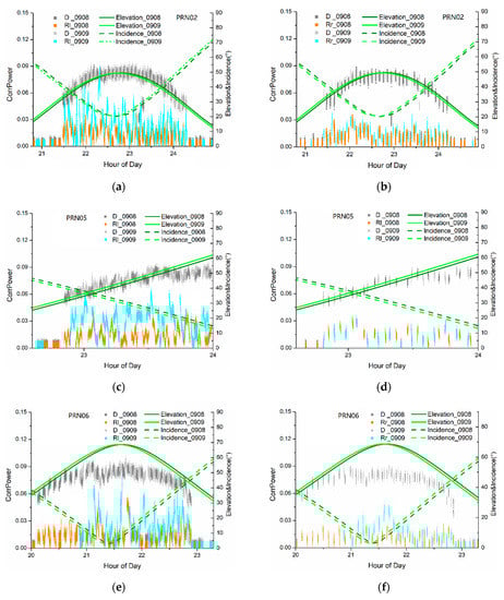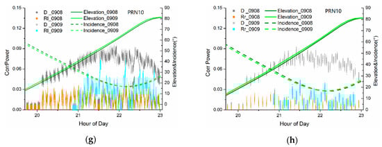 Correlation power of the direct and reflected signals in contrast with the elevation and incidence angles with respect to the antenna for different PRNs. (a) Direct, D, and LHCP reflected signals, Rl, of PRN 02, (b) direct, D, and RHCP reflected signals, Rr, of PRN 02, (c) direct, D, and LHCP reflected signals, Rl of PRN 05, (d) direct, D, and RHCP reflected signals, Rr of PRN 05, (e) direct, D, and LHCP reflected signals, Rl of PRN 06, (f) direct, D, and RHCP reflected signals, Rr of PRN 06, (g) direct, D, and LHCP reflected signals, Rl of PRN 10, (h) direct, D, and RHCP reflected signals, Rr of PRN 10. The 0908 and 0909 respectively represent 8th and 9th September 2014 (As an exception, in this figure, the incidence angle represents the angle between antenna bore sight and the reflected signal).