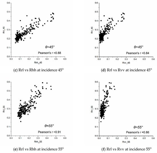 Correlation between GNSS LHCP reflectivity, Rrl, and ELBARA-II horizontal/vertical reflectivity, Rhh/Rvv, for three different incidence angles, namely 35°, 45°, and 55°, respectively, from top to bottom.