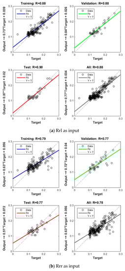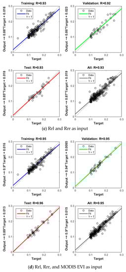 Figure 9 shows the neural net fitting results and Table 2 shows the regression coefficients and RMSEs of the four neural networks. In the first network, the input was GNSS LHCP reflectivity for 10 different incidence angles, from 20° to 65° in 5° intervals. The regression was 0.90 for the test samples, and 0.88 for all the samples. The root mean squared error (RMSE) between GNSS-R measurements and in situ soil moisture was 0.02 m3/m3 (Figure 9a). Then Rrr was set as input, the regression and RMSE were about 0.78 and 0.027 m3/m3, respectively, under the same conditions (Figure 9b). When Rrr was added together with Rrl as input, the regression improved to 0.92 and the RMSE was reduced to 0.016 m3/m3 (Figure 9c). Finally, EVI from MODIS was added as input together with Rrl and Rrr, and the regression improved to 0.94 and the RMSE was reduced to 0.014 m3/m3 (Figure 9d).