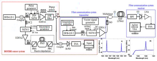 On the other hand, structural health monitoring is a key element of safety and management of various infrastructures. Conventional fiber sensors, for instance, fiber Bragg grating (FBG) and long period Grating (LPG) sensors measure only at a specific location of interest. Since around 10 years ago, the use of Brillouin based distributed fiber sensor systems for structural health monitoring applications has increased rapidly [,], due to their high measurement range up to tens of kilometers. The familiar techniques in time-domain based Brillouin fiber sensors are; Brillouin optical time-domain reflectometry (BOTDR) [] and Brillouin optical time-domain analysis (BOTDA) []. The BOTDR system is implemented using spontaneous Brillouin scattering (SpBS) which requires access to one end of the fiber. The BOTDA system uses stimulated Brillouin scattering (SBS) with counter-propagating continuous probe wave and access to both ends of the fiber is essential. Providing a new fiber infrastructure for a distributed sensing system comes at a huge cost with much complexity, which discourages their widespread use. Therefore, sharing an existing data transmission fiber infrastructure for distributed sensing offers cost-effectiveness and efficiency savings. For example, the railway industry uses a fiber infrastructure installed along the track-side for data transmission. The integration of distributed sensing system with the existing optical cable can be used for real-time condition monitoring of land-slides, track ballast, snowdrifts, flooding and line-side fire detection []. The integration of distributed sensing and active data transmission using a single optical fiber is an unexplored area of research.