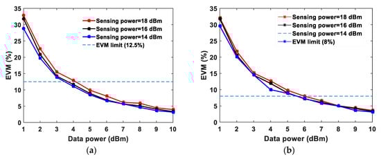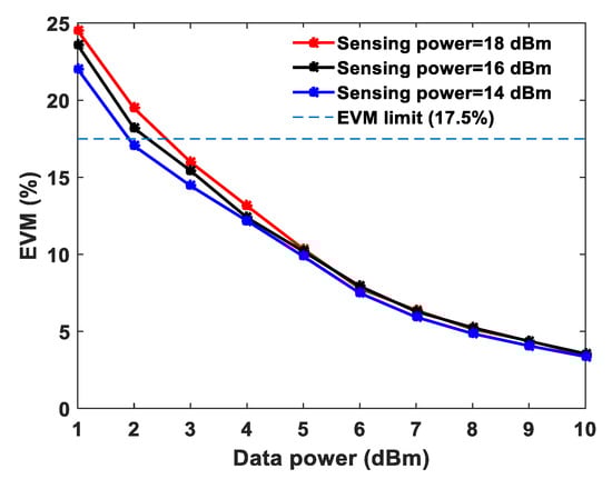 Measured error vector magnitude (EVM) of quadrature phase-shift keying (QPSK) for different data system powers at a fixed sensing power.