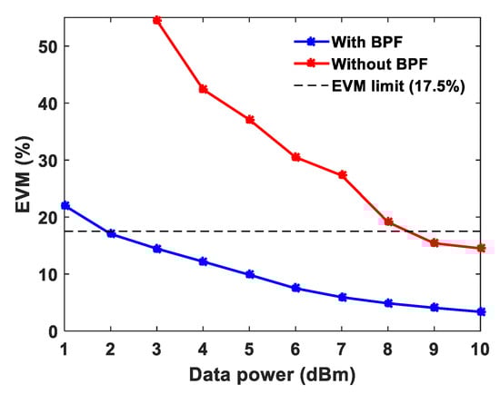 Measured EVM of QPSK modulation with and without band-pass filter (BPF) for various data system powers and fixed sensing power of 18 dBm.