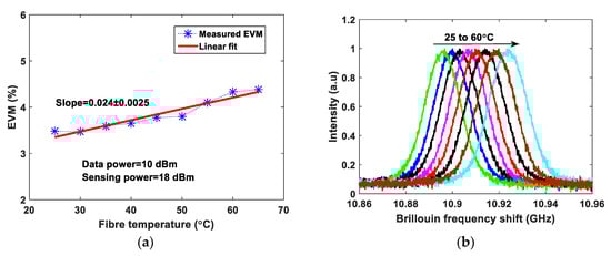 The EVM values at 1 dBm data power are ~24.5%, ~23.5% and ~22.1% obtained with the sensing powers of 18 dBm, 16 dBm and 14 dBm, respectively. The optimum sensing power is 18 dBm for a 25 km sensing fiber length []. At 10 dBm data system power, the measured EVM values are approximately the same at ~3.5% for the three different sensing system powers. The interference of the sensor signal and communication signal degrades the communication system performance, therefore, employing a BPF before the photodetector at the communication system receiver end is essential. Unfortunately, due to limited narrow band-pass filter availability, the wavelength spacing has been chosen in the experiments accordingly. The wavelength spacing between the distributed sensor and communication system can be closer to investigate the cross-impact on both the systems. This paper presents a proof-of-concept and feasibility of such emerging systems integration sharing a single fiber cable. In order to demonstrate the need for the optical BPF and mitigate the cross-interference in the proposed system, the EVM is analyzed with and without BPF at a fixed sensing system power of 18 dBm with QPSK modulation and the measured EVM values are shown in Figure 3. At 5 dBm data power the measured EVM values with and without BPF are 9.87% and 37.1%, respectively. Whereas, at 10 dBm data power the measured EVM values with and without BPF are 3.5% and 14.5%, respectively as shown in Figure 3. Without BPF, the sensing system power significantly influences the data signal, degrading the EVM performance. Thereafter, the EVM values are measured and analyzed for 16-QAM and 64-QAM modulation formats independently at fixed sensing powers, as illustrated in Figure 4a,b, respectively. In both modulation formats, at a 10 dBm data system power, the EVM values are approximately the same for various sensing powers. The obtained EVM values for 16-QAM and 64-QAM at 10 dBm data system power are ~3.4% and ~3.6%, respectively. The temperature effects have been measured in both data system and sensing system. The whole 25 km fiber was kept in a temperature-controlled oven and various temperatures were applied. The data power and sensing system powers are fixed at 10 dBm and 18 dBm, respectively. The EVM values of the data system (64-QAM) and Brillouin gain spectrum of the sensing system are measured simultaneously and the results are illustrated in Figure 5a,b. The measured EVM values are fitted with a linear curve and the obtained slope is 0.024 ± 0.0025%/°C. At room temperature (~25 °C), the obtained BFS is 10.89 GHz and the slope (temperature sensitivity) is 1.07 ± 0.013 MHz/°C.
