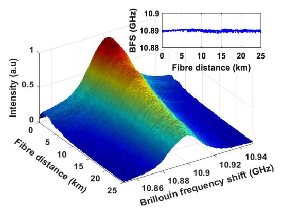 At room temperature (~25 °C) and at a fixed data system power (10 dBm) and a sensing power (18 dBm), the three-dimensional Brillouin spectrum is obtained and shown in Figure 6. Sweeping the Brillouin frequencies from 10.85 GHz to 10.95 GHz and a frequency step of 1 MHz, the three-dimensional spectrum was mapped. Using the Lorentz curve fitting, the peak Brillouin frequency over the 25 km fiber is illustrated in Figure 6 inset.