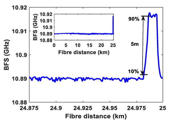 Finally, in order to evaluate the sensing system performance and spatial resolution in the presence of active data transmission, a 20 m fiber length at end of the fiber of the 25 km fiber is placed in the temperature-controlled oven and the rest of the fiber remains at the room temperature of 25 °C. The temperature was set at 50 °C in the oven. The peak Brillouin frequency over the 25 km optical fiber is illustrated in Figure 7 inset. The spatial resolution of 5 m is attained as shown in Figure 7, which confirms the 50 ns pulse width used in the BOTDR sensor system. For a 25 °C temperature change on 20 m long fiber at the fiber end, the estimated BFS change is 26.75 MHz, as the sensing fiber sensitivity is 1.07 MHz/°C. From Figure 7, the measured BFS change is 27.28 MHz for a temperature change of 25 °C. Therefore, the BFS error is 0.53 MHz, which corresponds to a temperature error of ±0.49 °C. The results validate a precise temperature measurement without any effects originated from the data communication system.