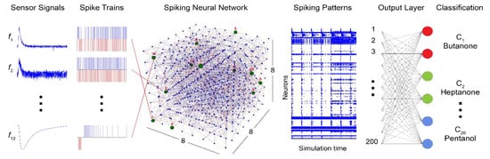 - Vanarse, A.; Osseiran, A.; Rassau, A. Real-time classification of multivariate olfaction data using spiking neural networks. Sensors 2019, 19, 1841. [Google Scholar] [CrossRef]