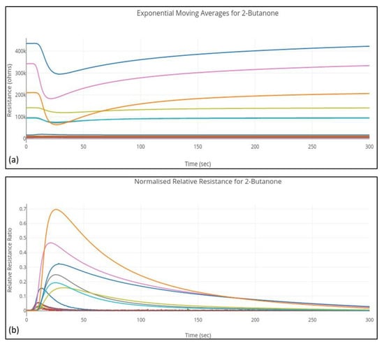 Feature sets for 2-Butanone sample. (a) Exponential moving averages. (b) Normalized relative resistance.