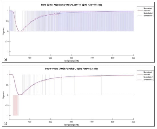 The temporal contrast-based encoding methods supported by the encoder include threshold-based representation (TBR), step-forward (SF) encoding, and moving-window (MW) encoding. Ben’s spiker algorithm (BSA) is the only stimulus estimation-based encoding method included in the NeuCube framework [,,].