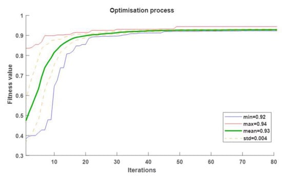 The optimization process rapidly started producing agents with an overall accuracy greater than 90% after the 10th iteration. However, the whole population reached that percentage after the 31st iteration with a standard deviation of ± 0.6%, which is a good indicator of the stability of the optimization process. The algorithm found the best solution (set of parameters) with a 94% overall accuracy in the 49th iteration; after that, the population’s overall accuracy average improved very little from 93% to 94%. Figure 4 shows the overall accuracy metrics at each iteration of the DE, and the summary of the parameters in the last iteration is listed in Table 2.