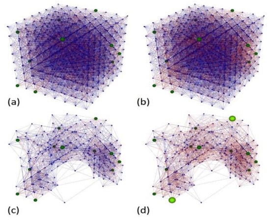 NeuCube model (a) before and (b) after training. Functional neurons and connections (c) before and (d) after training. Green dots indicate the input nodes, and brighter green dots indicate that the node fired a spike at the particular time of the snapshot. Blue and red lines indicate positive and negative connections, respectively. Each input odor sample is learned as a deep spatio-temporal pattern of connections.