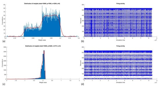 Inactive neurons in the SNNr, which did not have active connections with other neurons, were suspended from further use (temporarily pruned), which reduced the size of the reservoir from 512 to 223 neurons and the number of connections from 10,940 to 2881. This accelerated the processing time and reduced the memory use, especially during the supervised training and classification stages. As mentioned in Section 3.3, all neurons in the middle layer (reservoir) were connected to every neuron (sample) in the output layer. Therefore, the pruned SNN formed 223 instead of 512 output connections per sample, a significant reduction of the dimensionality of the space for classification. Figure 6 shows the number of positive and negative connections and their distributions before and after training. The number of connections that changed after training is listed in Table 3.