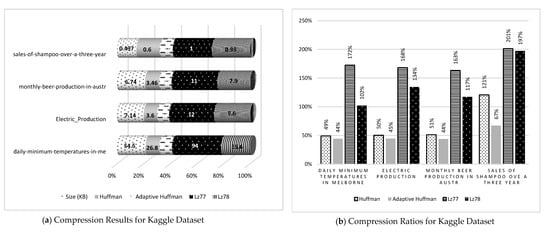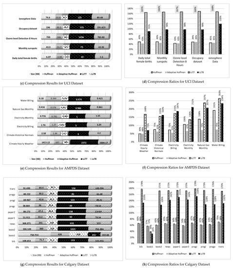 Figure 5 shows the results and ratios of compression algorithms have been categorized by the source of the datasets. a, c, e, g, and i show the compression results, whereas b, d, f, h, and j show the compression ratios. It is clear from compression results that the adaptive Huffman algorithm had the best values in all the datasets, although it equaled the canonical Huffman in some results such as in ozone level detection for eight hours in c and Book1 in g. In contrast, Lz77 got the worst results—in some cases the sizes of compressed files were even bigger than the original ones in many cases because of an inflation problem. However, there were cases where Lz78 obtained the worst results, especially for electricity monthly, electricity billing, and climate historical normally in e, which proves that compression results depend on the distribution and iterations in data.