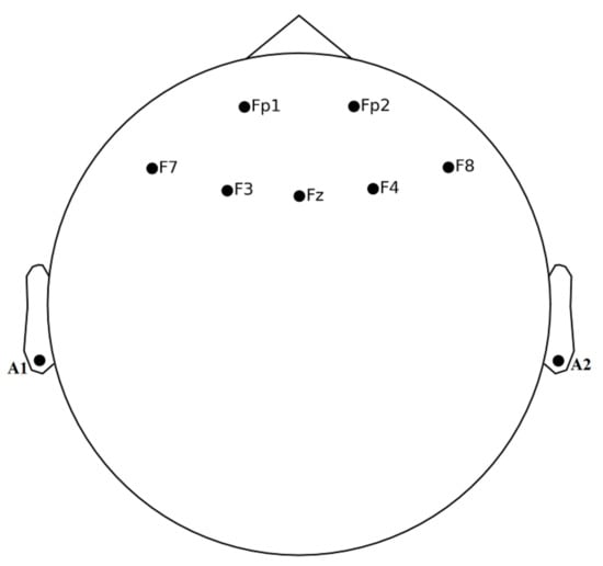 The EEG signals were recorded using the Discovery 24E system (BrainMaster Technologies Inc, Bedford, OH, USA). The system was equipped with 7-electrodes (Fp1, Fp2, F7, F3, F4, Fz, F) placed on the prefrontal cortex, as shown in Figure 2. The EEG electrodes were referenced to the earlobe electrodes (A1 and A2). The placement of the EEG electrodes was based on the 10–20 system and was sampled at 256 Hz.