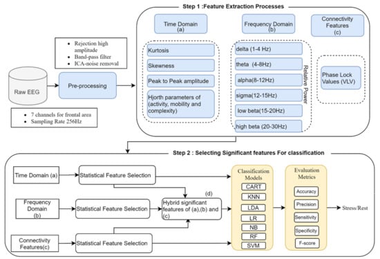 Current researchers acknowledge that multi-domain features and multi-channel analyses are required to create an effective information feature space in which a good interpreter can eventually produce effective alarms for the current mental state. As a result, studies presented by Attallah [] and Hasan [] revealed that hybrid feature sets from various domains (time domain, frequency domain, and time-frequency domain) may enhance the overall classification of EEG emotion analysis. To the best of our knowledge, no study on fusing such domains with functional connectivity network features has been done. In contrast to the majority of cortical activation features, which focus on a single channel feature, functional connectivity features look for relationships and interactions across different regions of the brain (inter-channel relations). This knowledge aids in a better understanding of how the brain functions and could offer more accurate representations of mental stress states. To address the aforementioned limitation, this study aims to investigate the fusion of functional connectivity network features with cortical activation features from the time and frequency domains to detect mental stress in order to aid in the development of wearable devices. In contrast to prior research, our objective is to combine single-channel features with inter-join channel features (connectivity). Thus, we employ a well-established clinical assessment method using salivary alpha amylase (cortisol measure) to enhance the labeling of the task given. We then propose an objective method based on the machine learning framework to classify stress levels with a minimum number of EEG channels. We present a novel methodology to identify mental stress by investigating the statistical difference between stress and rest conditions. The proposed method is analyzed and evaluated using seven classifiers [], namely: KNN, RF, Logistic Regression (LR), SVM, classification and regression Decision Tree (CART), Linear Discrimination Analysis (LDA), and NB. The accuracy, precision, recall, and F-score matrices were used to evaluate the performance of the classifiers.