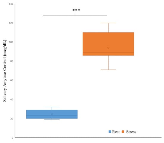 The mean and standard deviation of the salivary amylase cortisol measured by (mcg/dL) for rest and stress conditions.