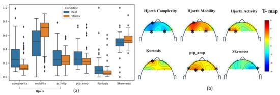 In EEG signal analysis, an independent-sample t-test was conducted to compare stress and rest for each feature-based electrode. The star symbols are used in topographic maps to show the significant electrodes per feature. For time-domain features, Figure 5a shows the mean and standard deviation of the Hjorth complexity, Hjorth mobility, Hjorth activity, kurtosis, peak-to-peak amplitude , and skewness of EEG signals at 1–30 Hz for stress and rest conditions, which were taken by averaging all subjects’ data for each condition.