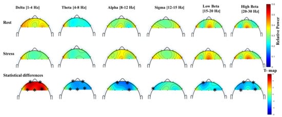 The mean topographic maps for relative bands power of delta, theta, alpha, sigma, low beta, and high beta at 1–30 Hz for rest and stress conditions. The difference between stress and rest relative powers are shown using T-maps. The star (*) symbols denote to the significant electrodes related to specific feature (two-sample t-test; p < 0.01, Bonferroni correction).