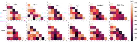 Similarly, Figure 7 shows the functional connectivity network features of PLV, which measures the changes (increase/decrease) in the connectivity network between two pairs of channels. The PLV was extracted from six frequency bands of both tasks (rest/stress). The significant channels denoted either an increase or decrease (*+/*−) in the connectivity network measurements from the rest condition to the stress condition. From Figure 7, it can be seen that significant functional connectivity networks in delta and alpha decreased from the rest condition to the stress condition. On the other hand, high beta shows an increase in the connectivity network from the rest condition to the stress conditions. Other bands showed increases and decreases in the connectivity network between different brain regions. The significant discrimination connectivity features between stress and rest conditions were selected using a t-test and fused with other significant features from the time and frequency domains.