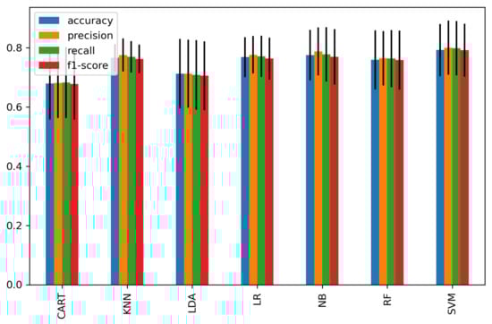 We further analyze the classification accuracy of stress based on the first scenario using CAR, KNN, LDA, LR, NB, RF, and SVM classifiers. The temporal features of the peak-to-peak amplitude of the significant channels—‘F7’, ‘F3’, ‘Fz’, and ‘F8’—showed the highest classification accuracy of 79.4% using SVM. Meanwhile, the frequency-domain features of the high beta band (20–30 Hz) at significant channels of ‘Fp1’, ‘Fp2’, ‘F3’, and ‘F4’ achieved the highest classification accuracy of 73% using KNN.